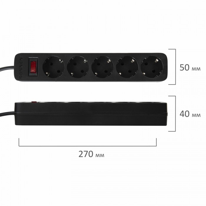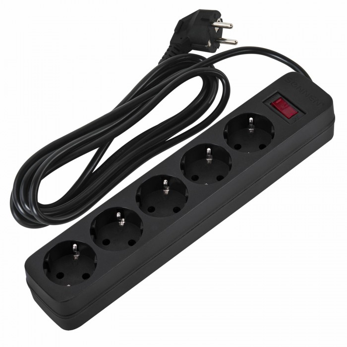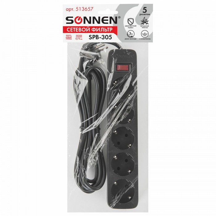 Сетевой фильтр SONNEN SPB-305, 5 розеток с заземлением, выключатель, 10 А, 3 м, черный, 513657