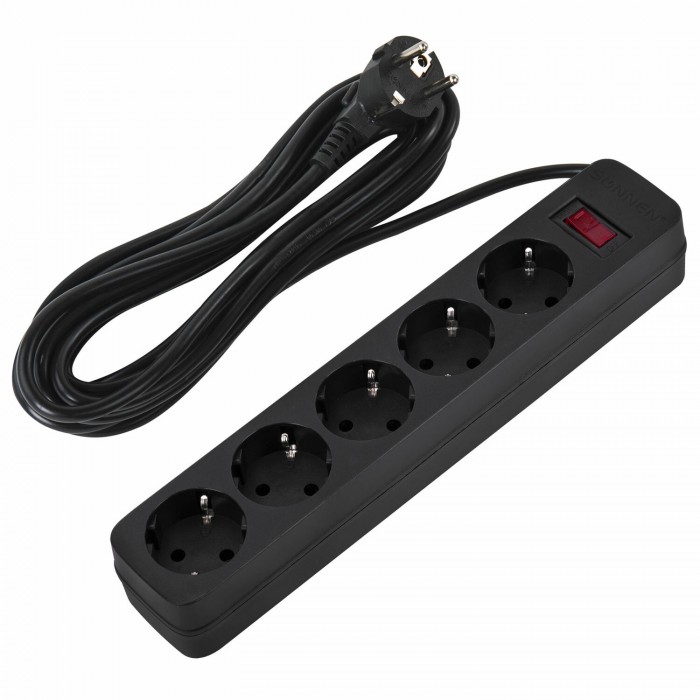 Сетевой фильтр SONNEN SPB-505, 5 розеток с заземлением, выключатель, 10 А, 5 м, черный, 513658