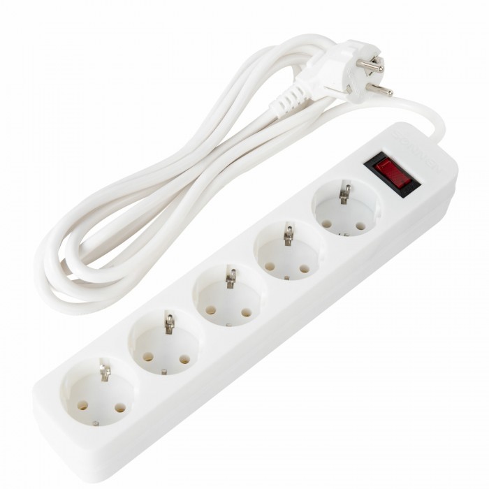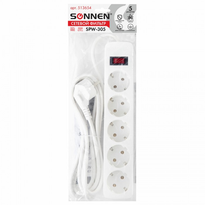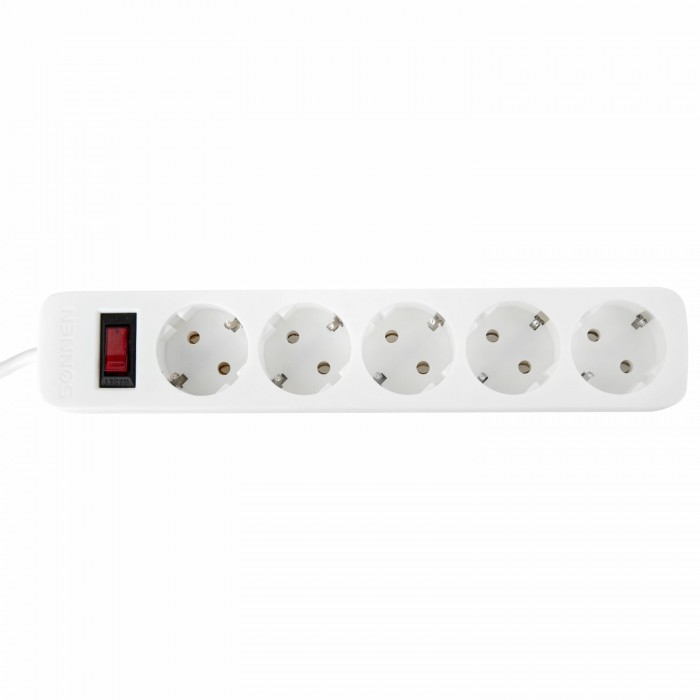 Сетевой фильтр SONNEN SPW-305, 5 розеток с заземлением, выключатель, 10 А, 3 м, белый, 513654