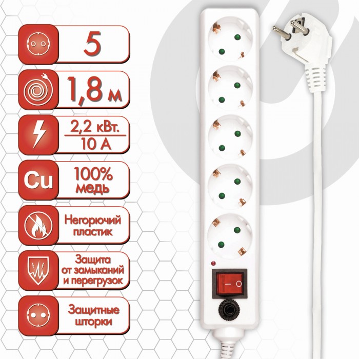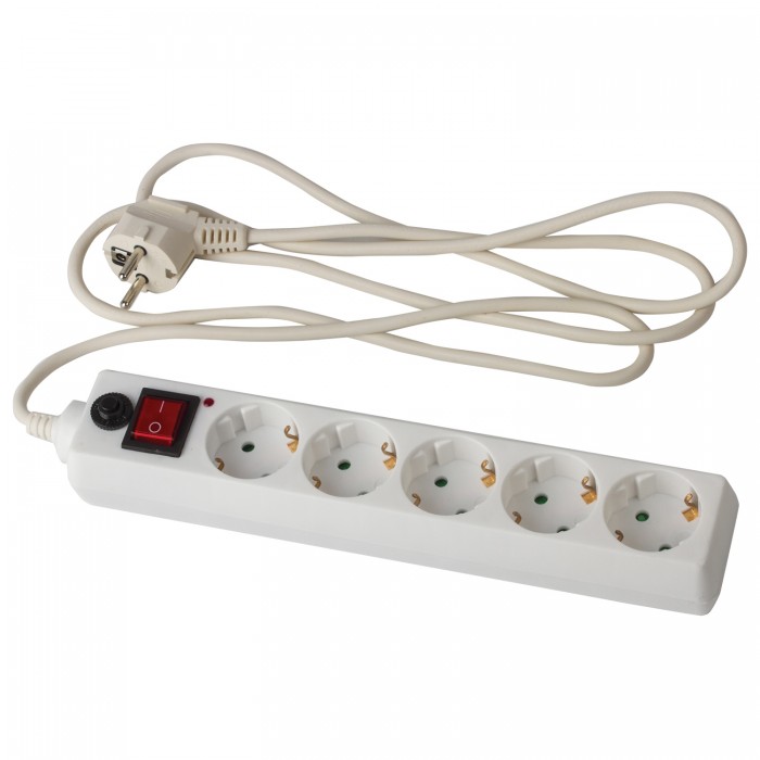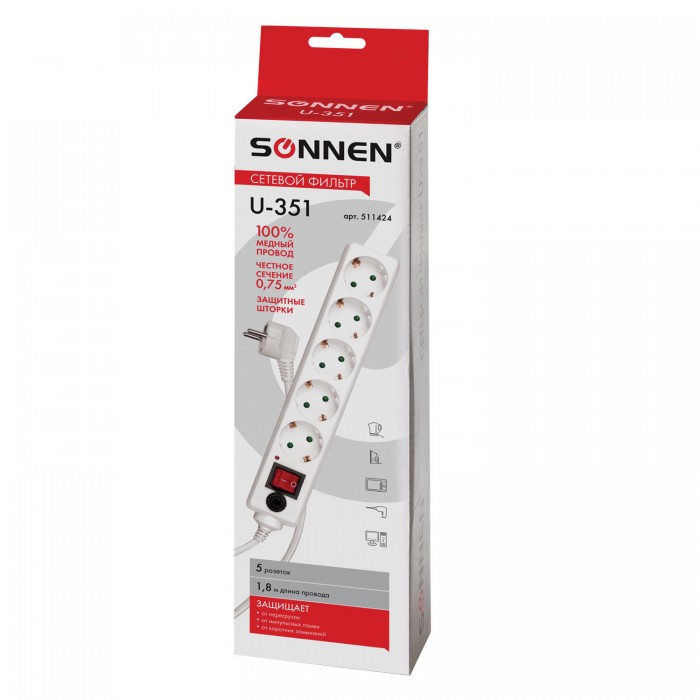 Сетевой фильтр SONNEN U-351, 5 розеток, с заземлением, выключатель, 10 А, 1,8 м, белый, 511424