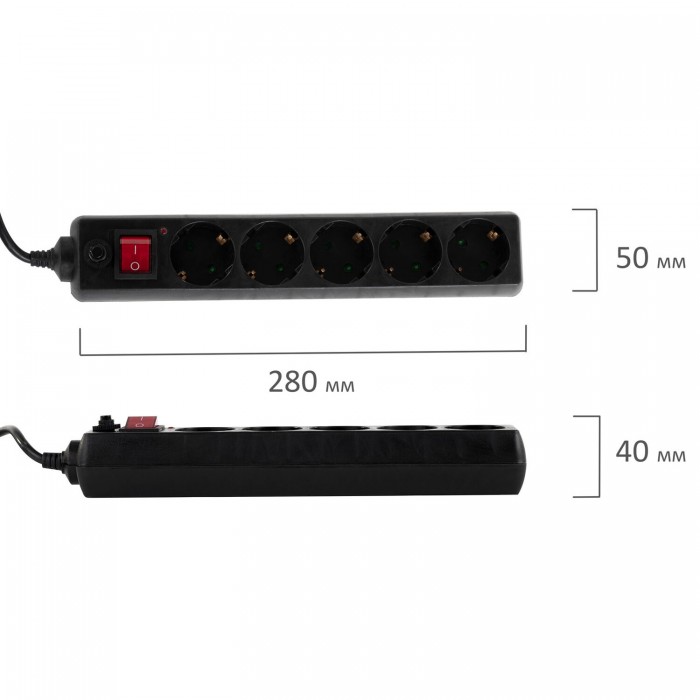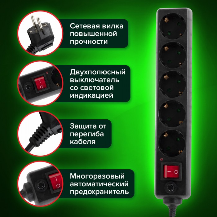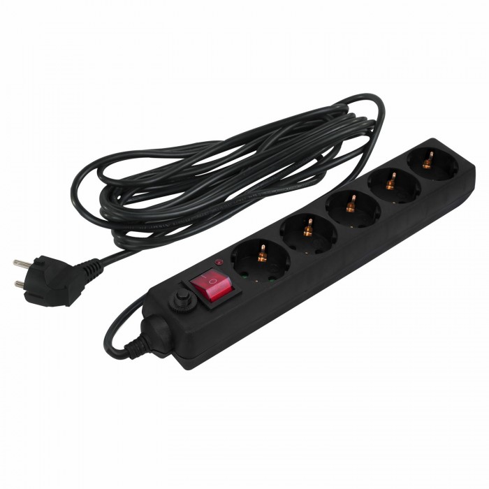 Сетевой фильтр SONNEN U-3515, 5 розеток, с заземлением, выключатель, 10 А, 5 м, черный, 513490