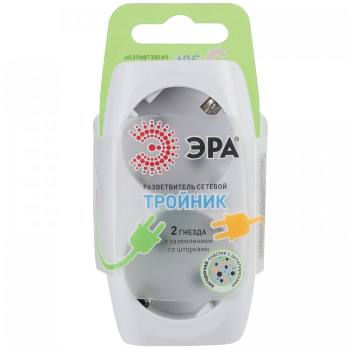 Сетевой тройник ЭРА, 2 розетки, с заземлением, со шторками, белый, SP-2e-W