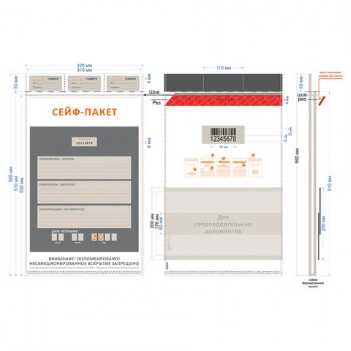 Сейф-пакеты изготовлены из непрозрачного, влагонепроницаемого материала, исключающего возможность просмотра вложений и воздействия окружающей среды. Предназначен для пересылки и транспортировки ценных бумаг, договоров, денег и драгоценных металлов.