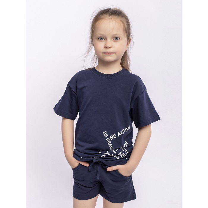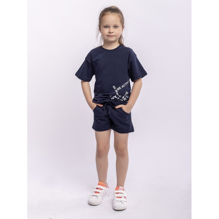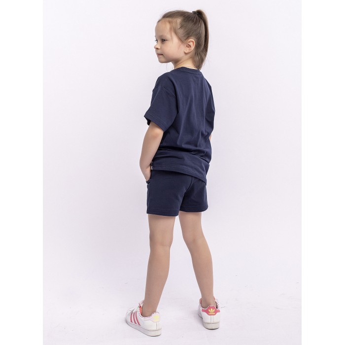 Шорты для девочки синие спортивные из футера. Шнурок в поясе, карманы по бокам.