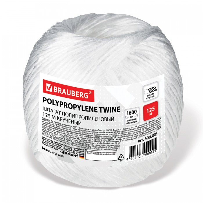 Полипропиленовый шпагат BRAUBERG отлично подходит для хозяйственных и бытовых нужд в домашнем и дачном хозяйстве. Активно применяется в обвязке, упаковке товаров и посылок, подвязки растений и деревьев, плетении, декорировании.
