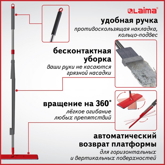 Швабра с отжимом LAIMA предназначена для проведения влажной уборки помещений. Можно применять для мытья вертикальных, горизонтальных поверхностей, напольных покрытий любого типа.