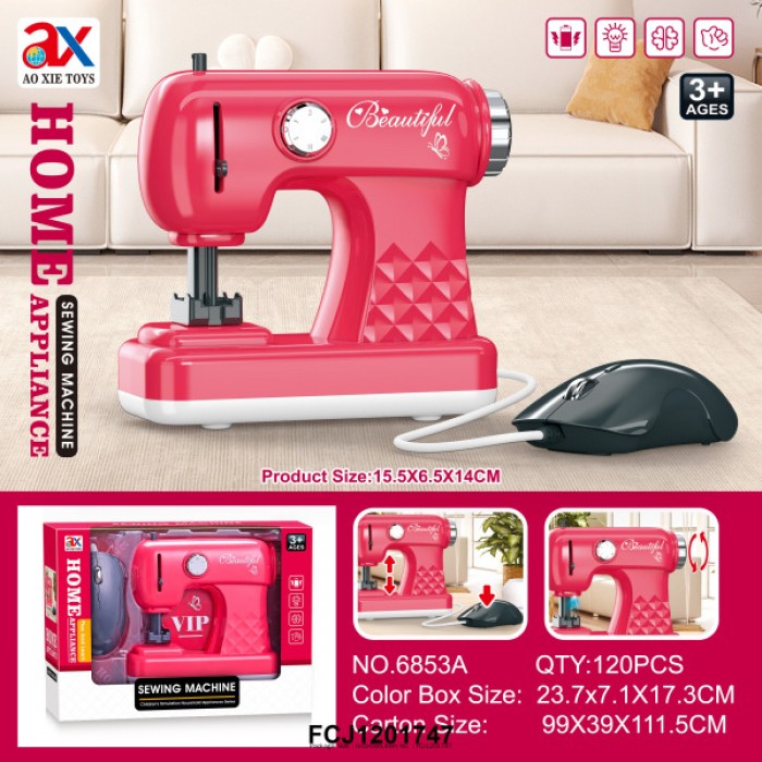 Размер упаковки: 24 х 7,4 х 17,5 см Размер изделия: 15 х 7 х 14 см Функционал: аксессуар для кукол, бытовая техника Вид упаковки: картонная коробка открытого типа с блистером Страна-изготовитель: Китай Материал: пластик, металл Комплектация: швейная машинка - 1 шт Возраст ребенка: для детей от 3 лет Швейная машинка привлекает внимание не только своим ярким внешним видом, но и функциональностью. Особенности: - реалистичная модель; - машинный режим, с помощью мыши; - световые эффекты; - подвижное маховое колесо; - имитация строчки; - подвижный рычаг подъем лапки; - необходимы 2 батареи АА 1.5 V (не входят в комплект).