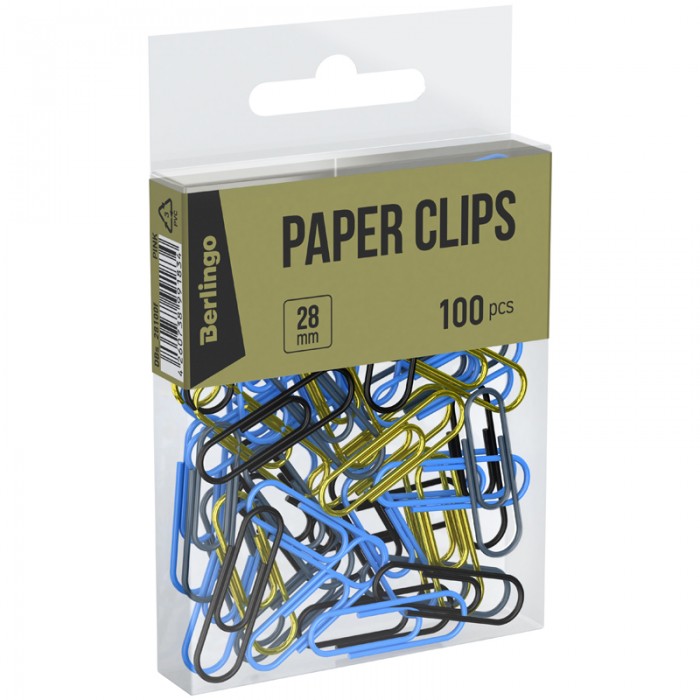 Скрепки 28мм, Berlingo, 100шт., цветные, ПВХ упак., европодвес, голубой+золотой