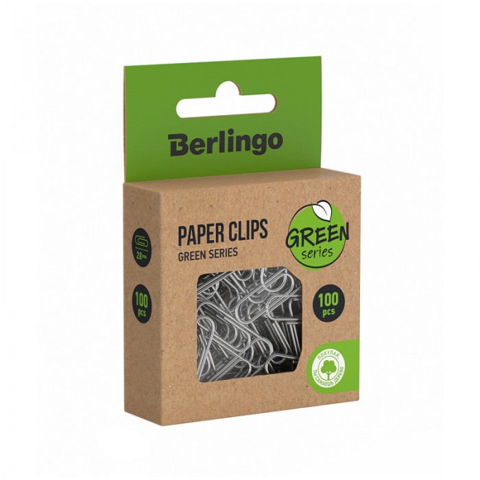 Скрепки 28мм, Berlingo "Green Series", 100шт., никелированные, крафт упак., европодвес