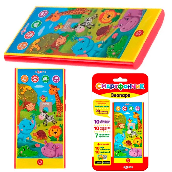 Размер изделия: 14,4х7,3х1 см Технические параметры: Электронная музыкальная игрушка из пластмассы, упаковка: картонка с блистером 22см x 13см x 2см Батарейки: ААА Ваш малыш любит животных? Интерактивный смартфончик «Зоопарк» познакомит его с обитателями жарких стран: львом, слоном, бегемотом, крокодилом и другими. Нажимай на картинки – и зверюшки споют о себе веселые песенки! Переключай режимы – отгадывай загадки, угадывай голоса животных, слушай хиты из мультиков: «Чунга-чанга», «Песня Львёнка и Черепахи», «Песенка о жирафе», «Песенка о лете», «Песенка друзей», «Песенка мамонтёнка», «Настоящий друг». Супербонус для всех покупателей смартфончика «Зоопарк» – приложение от Азбукварика! Отсканируй QR-код внутри упаковки – скачай бесплатно игру для смартфона или планшета.