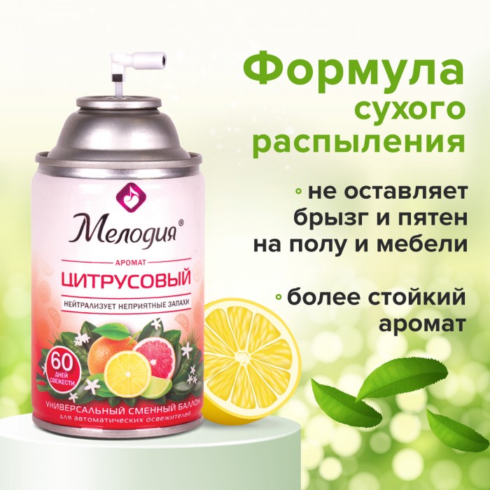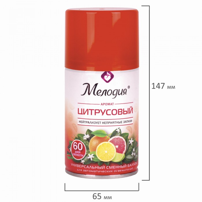 Сменный баллон МЕЛОДИЯ "Цитрусовый" быстро и эффективно устраняет неприятные запахи и освежает воздух в жилых и бытовых помещениях. Имеет приятный стойкий аромат, который надолго наполнит помещение свежестью.