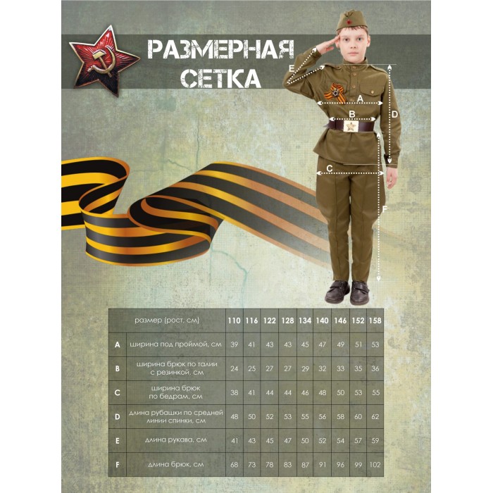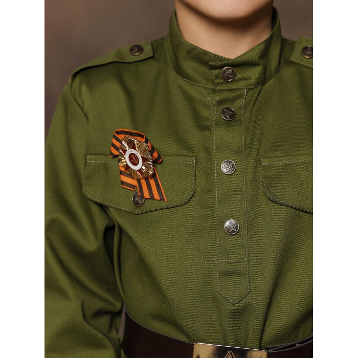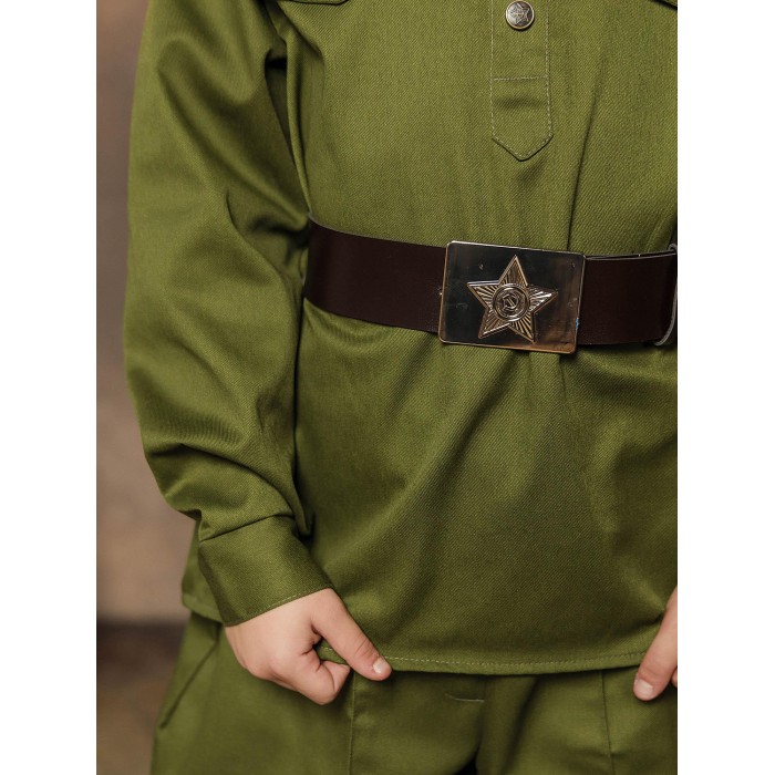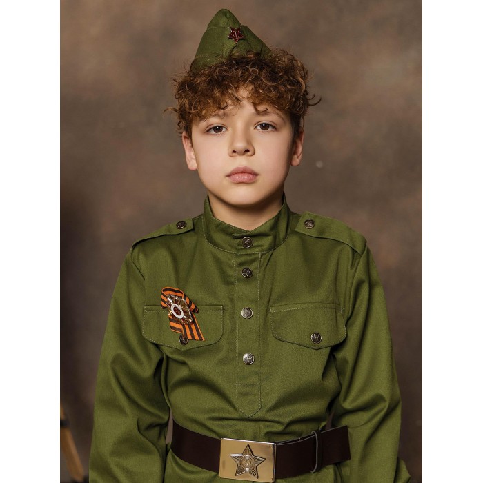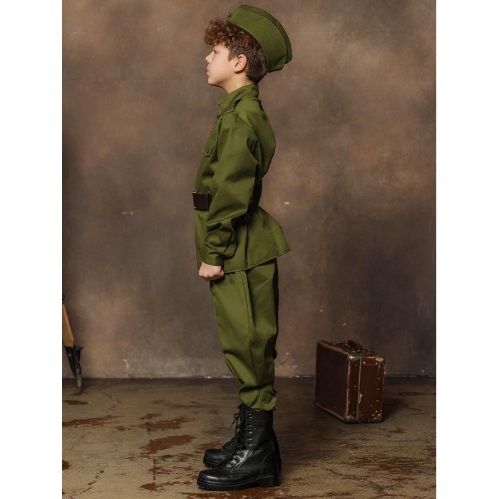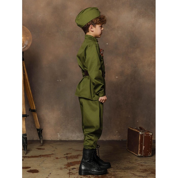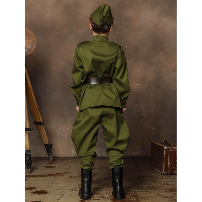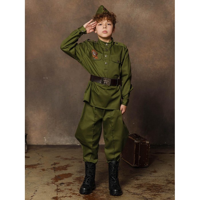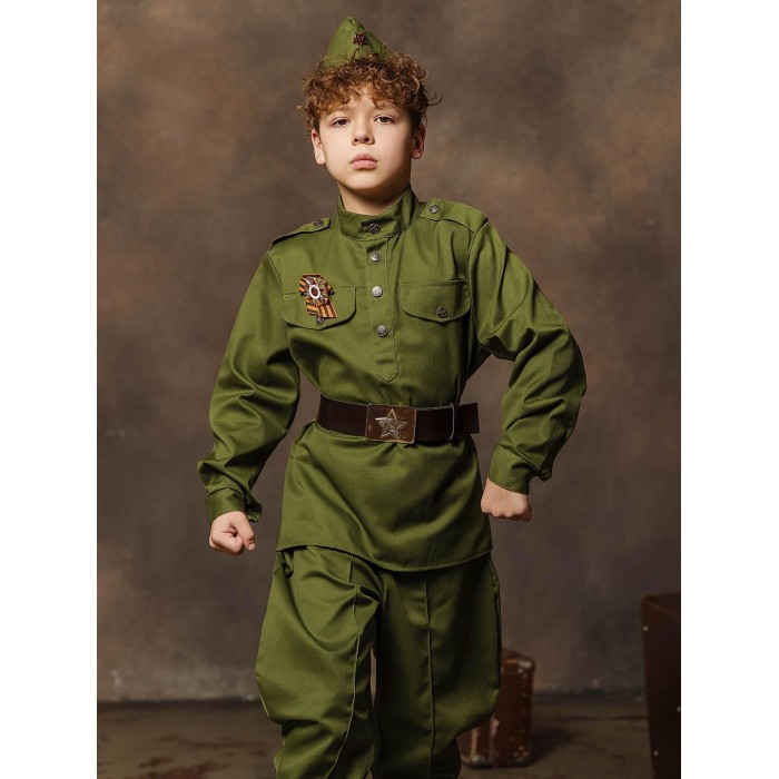 Еще одна вариация детского военного костюма Солдат для мальчиков. Образ в точности повторяет солдатскую форму времен Великой Отечественной войны и будет актуален на 9 мая, 23 февраля, Новый год и другие праздники, а также подойдет для спектаклей и номеров в детском саду и школе.