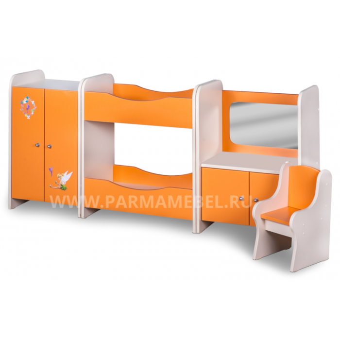 - В комплект входят: двустворчатый шкаф для кукольного белья, трюмо с настоящим зеркалом и стульчиком, двухъярусная кровать