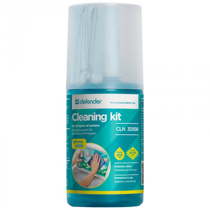 Очищающий спрей для экранов Defender CLN Optima 200мл в комплекте с салфеткой из микрофибры. Обеспечивает экономичное расходование. Подходит для экранов всех типов, стёкол, зеркал.