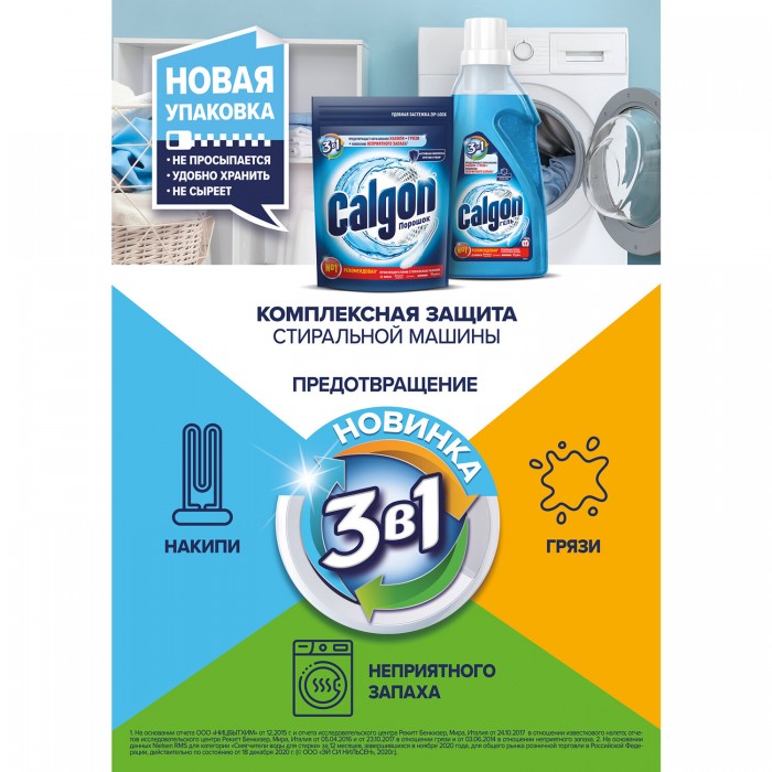 Средство для удаления накипи в стиральных машинах CALGON смягчает жесткую воду, повышая эффективность стирки. Защищает все жизненно важные части стиральной машины от накипи.
