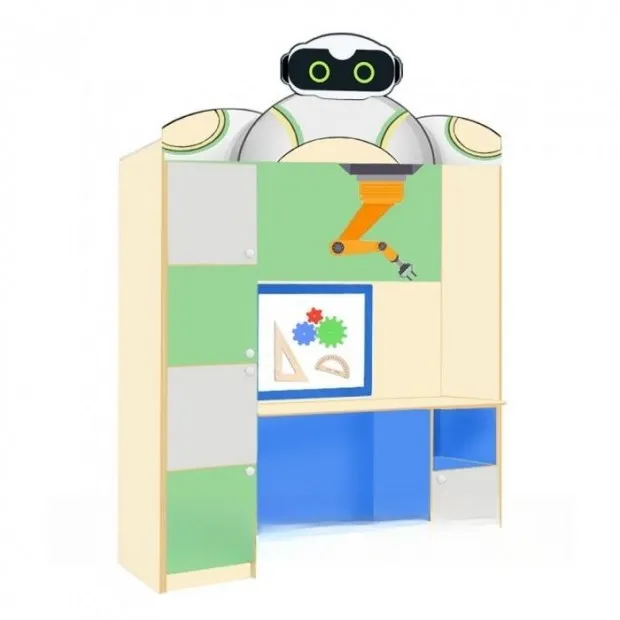 Корпус, стеллаж, задник, тумба из ЛДСП. Накладки из МДФ, фанеры. Краска. Размеры: 1400х350х2000мм Вес: 90кг. Объём: 0,2 м/куб. Подробнее: Стол с тумбой ЛДСП 1000х400х550мм Стеллаж 400х350х1600мм Магнитно-маркерная доска 600х400мм. Бизиборд - роботизированный манипулятор 1шт. Бизиборд шестерёнки на магнитах - 3шт. Транспортир на магнитах - 1шт. Треугольник на магнитах - 1шт.