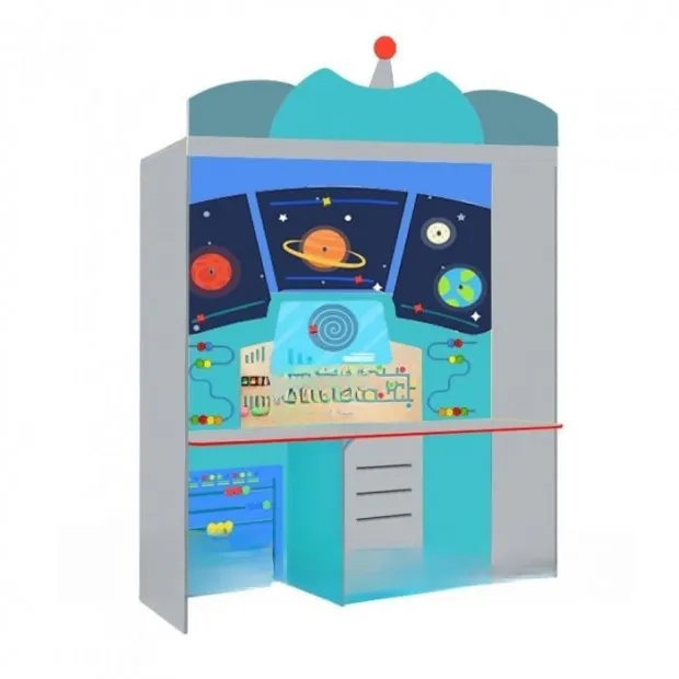 Корпус, задник, стол с тумбой из ЛДСП. Накладки из МДФ, фанеры. Краска. Размеры: 1400х350х2000мм Вес: 85кг. Объём: 0,2 м/куб. Бизиборды: Радар -1шт. Пульт управления - 1шт. Блок управления - 1шт. Крутящиеся планеты - 4шт. Движущиеся звёзды - 4шт. Шарики лабиринты - 2шт.