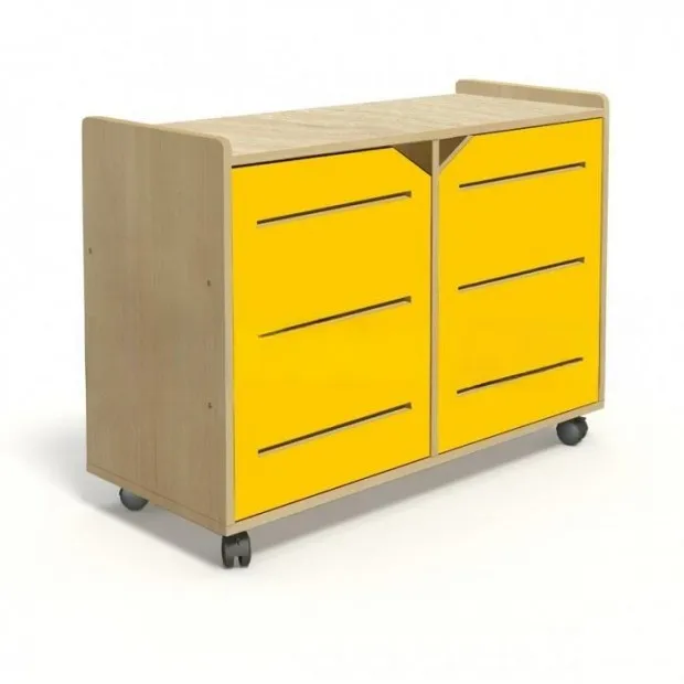 Из ЛДСП Бук и Цветного Кромка,Кант ПВХ. Фасады МДФ,покрытие краска Тиккурила. Задник стеллажа ЛДСП в цвет корпуса. Размеры: 900 х400х754 мм Вес: 35кг Объём: 0,06м/куб Установлены пластиковые или усиленные поворотные прорезиненные колеса. 2 из них со стопором (тормозом). ЛДСП БУК , колесо ПЛАСТИК