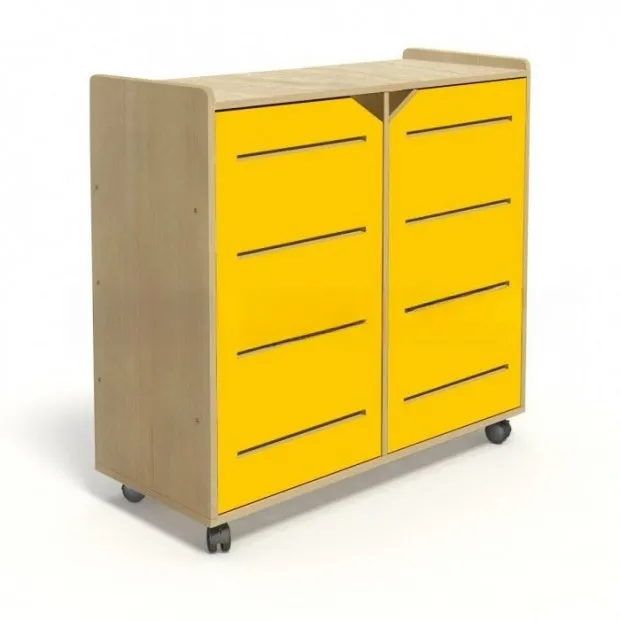 Из ЛДСП Бук и Цветного Кромка,Кант ПВХ. Фасады МДФ,покрытие краска Тиккурила. Задник стеллажа ЛДСП в цвет корпуса. Размеры: 900 х400х980 мм Вес: 45кг Объём: 0,075м/куб Установлены пластиковые или усиленные поворотные прорезиненные колеса. 2 из них со стопором (тормозом). ЛДСП БУК , колесо ПЛАСТИК