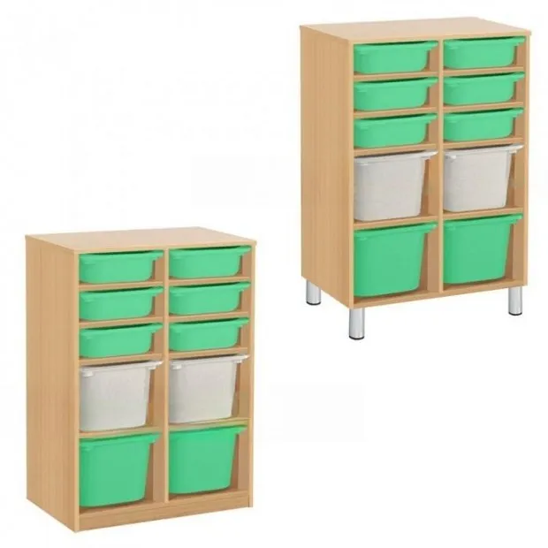 Из ЛДСП Бук или Цветного Размеры: 670х400х12 00мм Вес: 40кг Объём: 0,13м/куб Контейнер ПВХ: 295 х395х140мм - 6 шт. Контейнер ПВХ: 295 х395х200мм - 4 шт. на полках. Крепёж к стене обязателен. ЛДСП БУК на цоколе