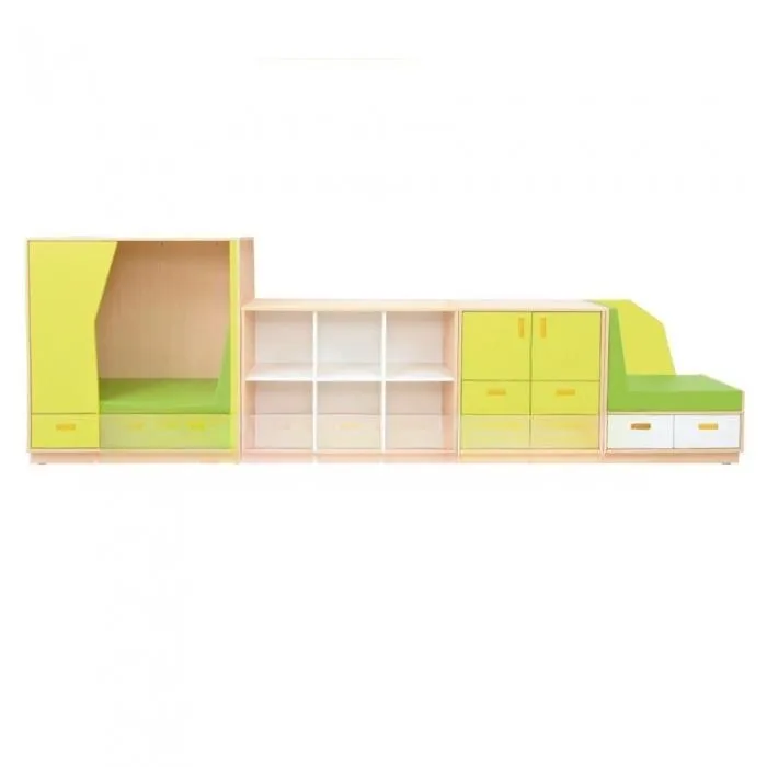 Из ЛДСП Бук или Цветного Мягкий модуль - 2 штуки. Размеры: 4200х500х1200 Контейнер ПВХ: 300х420х100мм - 2шт. Вес: 190кг Объём: 0,4м/куб Крепёж к стене обязателен. Корпус и фасады БУК