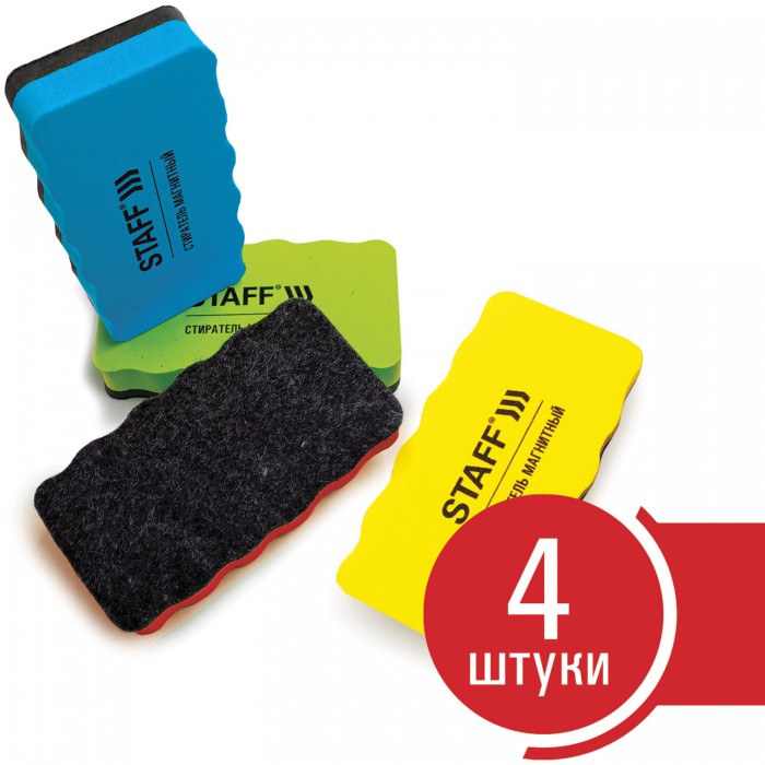 Стиратели магнитные для магнитно-маркерной доски, 57х107 мм, КОМПЛЕКТ 4 ШТ., STAFF "Basic", ассорти, 237512