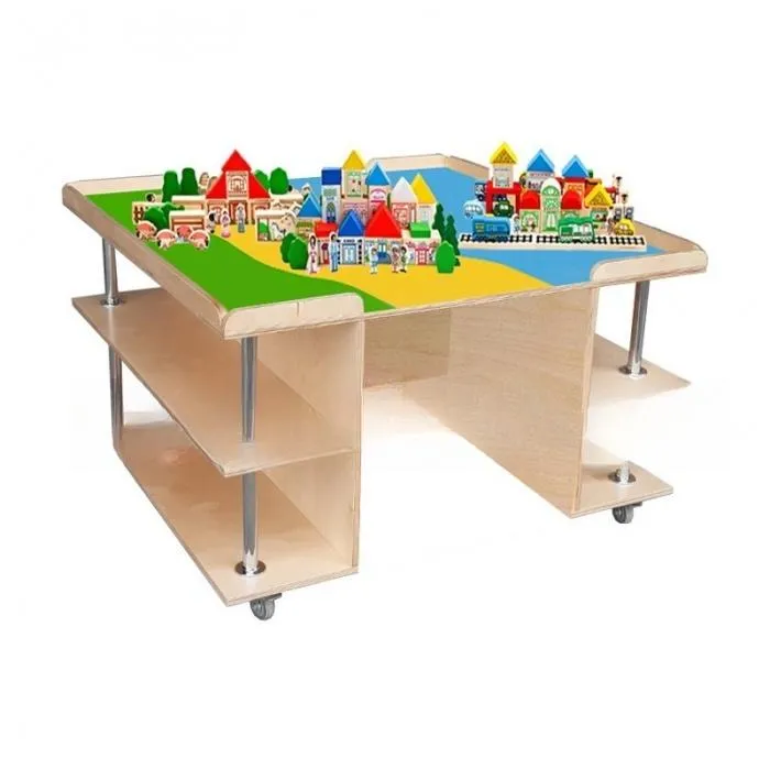 Из ЛДСП Бук или Цветного. Кромка ПВХ. Или из фанеры (ЛАК). Размеры: 970х970х580/630мм Вес: 34кг Объём: 0,09м/куб 27 элементов ландшафта из фанеры. 143 фигурки городок/ферма/транспорт. Установлены пластиковые или усиленные поворотные прорезиненные колеса. 2 из них со стопором (тормозом). Стол двухместный. ЛДСП БУК , колесо ПЛАСТИК