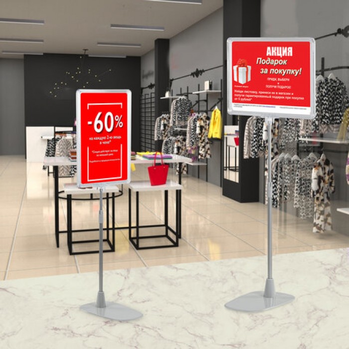 Напольная стойка-держатель идеальна для донесения визуальной информации до клиента или посетителя. Подходит для использования в магазинах, выставочных залах, на предприятиях. Обладает функцией регулировки по высоте.