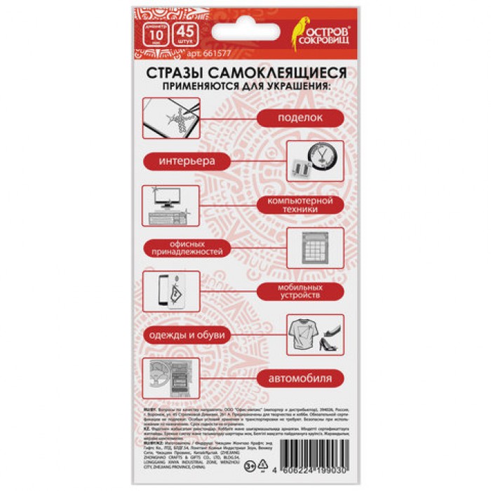 С помощью самоклеящихся страз ОСТРОВ СОКРОВИЩ можно декорировать поделки и аппликации, детали интерьера, одежду и гаджеты, реализовать самые смелые творческие идеи.