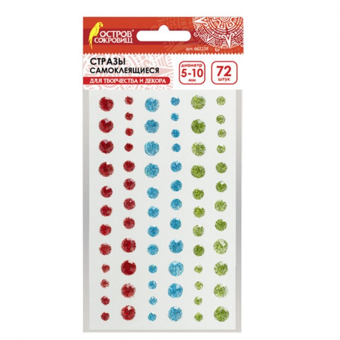 Стразы самоклеящиеся КРУГЛЫЕ, 5-10 мм, 72 штуки, блестящие, на подложке, ОСТРОВ СОКРОВИЩ, 662238