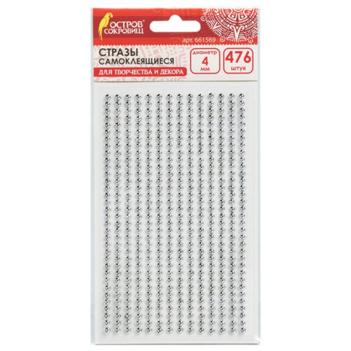 Стразы самоклеящиеся "Круглые", цвет серебро, 4 мм, 476 шт., на подложке, ОСТРОВ СОКРОВИЩ, 661569