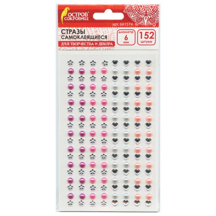 Стразы самоклеящиеся "Жемчуг", ассорти, 6 мм, 152 шт., на подложке, ОСТРОВ СОКРОВИЩ, 661574
