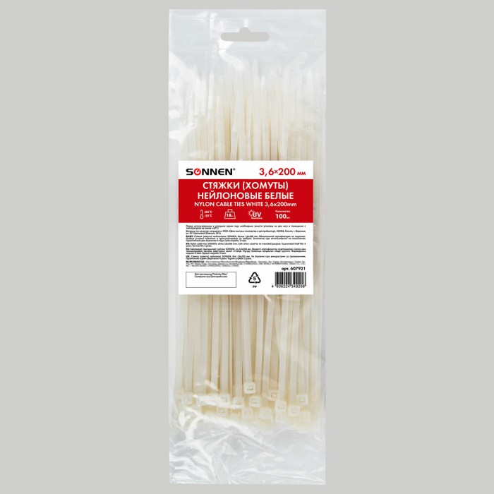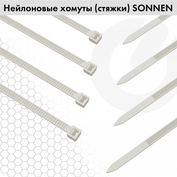 Стяжки (хомуты) нейлоновые SONNEN используются при проведении электромонтажных работ для крепления кабелей, проводов и других предметов к несущей поверхности или для соединения между собой. Такие стяжки также используются для бытовых и хозяйственных нужд.