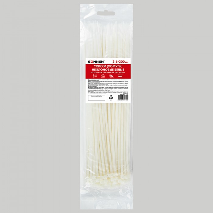 Стяжки (хомуты) нейлоновые SONNEN используются при проведении электромонтажных работ для крепления кабелей, проводов и других предметов к несущей поверхности или для соединения между собой. Такие стяжки также используются для бытовых и хозяйственных нужд.