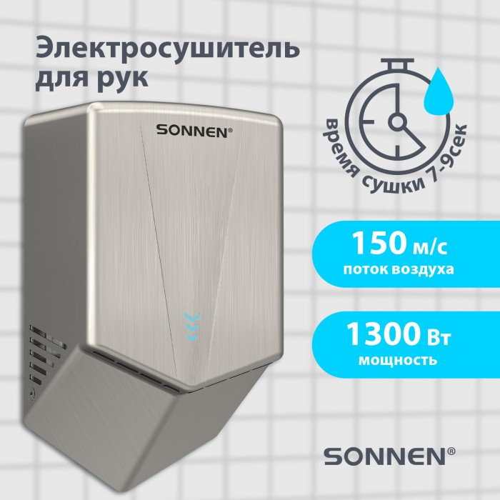 Сушилка для рук ВЫСОКОСКОРОСТНАЯ АНТИВАНДАЛЬНАЯ SONNEN K2022A, 1300 Вт, 150 м/с, IPX1, 72 дБ, нержавеющая сталь, 607191