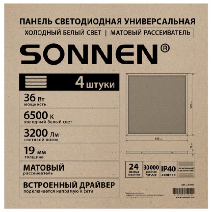Светильник светодиодный АРМСТРОНГ SONNEN, холодный свет 6500K, 595х595х19, 36Вт, матовый, 237858