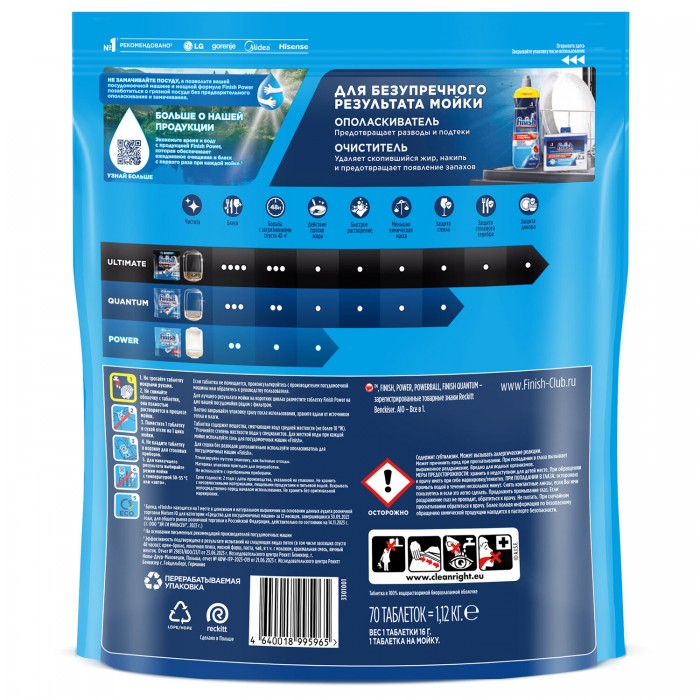 FINISH Power "All in 1" – это удобные в использовании мультифункциональные таблетки для посудомоечной машины. Красный ингредиент таблетки Powerball отмывает посуду до сияющего блеска.