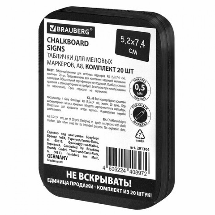 Табличка меловая A8 (5,2x7,4 см), КОМПЛЕКТ 20 штук, пластиковая, 0,5 мм, ЧЕРНАЯ, BRAUBERG, 291304