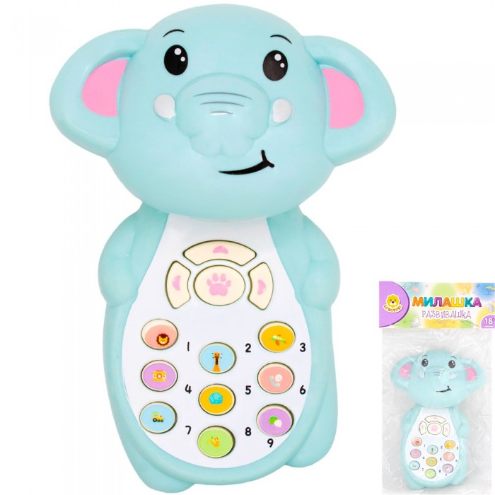 Размер упаковки: 23 х 15 х 0,2 см Размер изделия: 14 х 9 х 2,5 см Функционал: развивающие интерактивные игрушки Вид: телефон Материал: пластик Комплектация: телефон интерактивный – 1 шт Тип упаковки: пакет с картонным хедером Страна изготовитель: КНР Возраст ребенка: для детей от 3+ лет Интерактивный телефон «Милашка - развивашка» в виде милого слоненка непременно привлечет внимание малыша и одновременно позволит ему развлекаться и познавать новое. Игра с телефоном способствует развитию у ребёнка мелкой моторики, координации, фантазии, визуального и музыкального восприятия. Размер и форма игрушки удобны для детских ручек. Кнопки, которые легко нажимаются. Забавные звуки и мелодии. Игрушка изготовлена из высококачественных материалов. Работает от батареек «АА» (в комплект не входят).