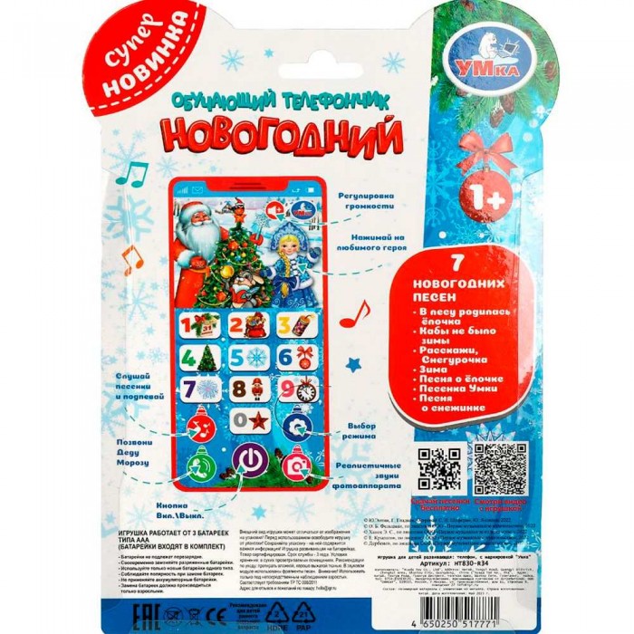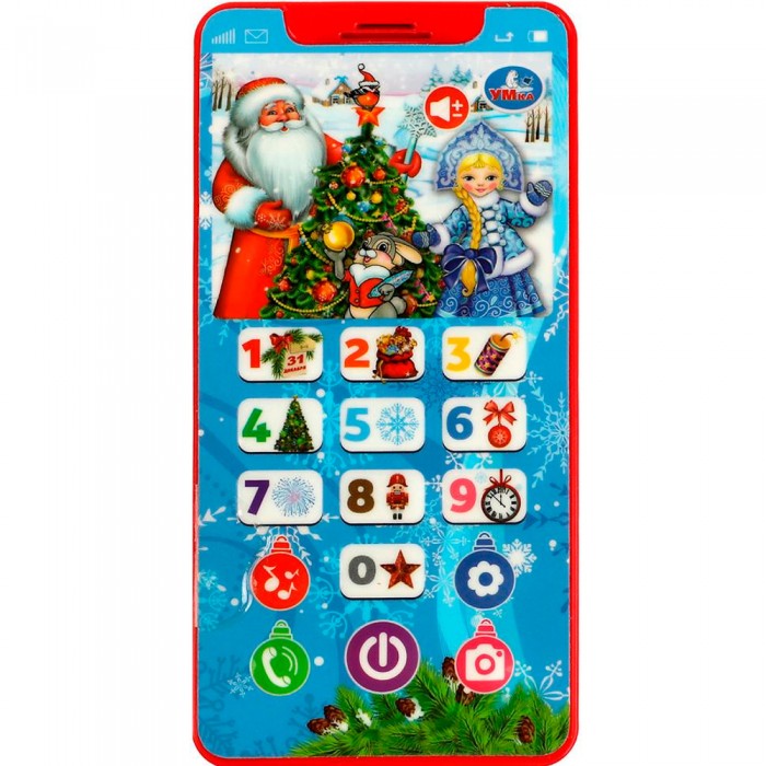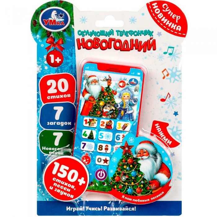 Размер упаковки: 16 x 2 x 23 см Размер изделия: 5 x 2 x 10 см Функционал: развивающая игрушка на батарейках Вид упаковки: блистер с картонной подложкой Страна производитель: Китай Материал: полимеры Комплектация: телефон - 1 шт, батарейки - 3 шт Возраст ребенка: для детей от 3 лет Обучающий телефончик «Новогодний» ТМ «УМка» станет прекрасным подарком для ребёнка. Особенности: - 7 новогодних песен: «В лесу родилась ёлочка», «Кабы не было зимы», «Расскажи, Снегурочка», «Зима», «Песня о Ёлочке», «Песенка Умки», «Песня о Снежинке» - реалистичнее звуки фотоаппарата - режим «Позвони деду Морозу» - 20 стихов - 7 загадок - кнопка «Вкл./Выкл.» - регулировка громкости - работает от 3-х батареек типа ААА (в комплекте)