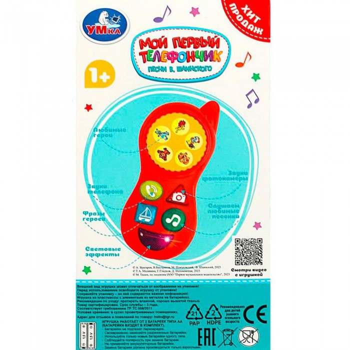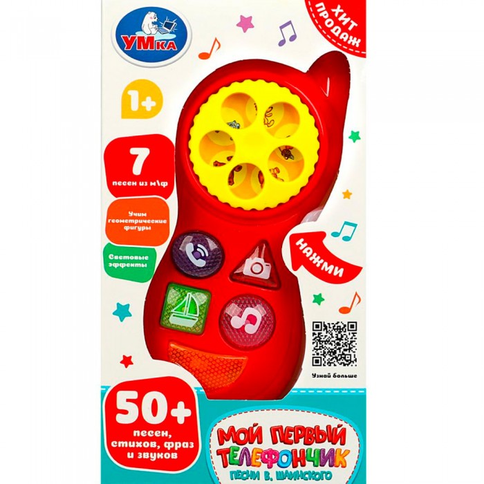 Размер упаковки: 9 х 5 х 17 см Размер изделия: 6 х 3 х 13 см Функционал: детская музыкальная игрушка Вид упаковки: картонная коробка Страна-изготовитель: Китай Материал: пластик Комплектация: музыкальная игрушка - 1 шт Возраст ребенка: для детей от 1 года Развивающая игрушка «Мой первый телефон» ТМ «УМка» непременно понравится маленьким любознайкам. Особенности: - 7 песен из м/ф (фрагменты): «По дороге с облаками», «Улыбка», «Песенка Львёнка и Черепахи», «Песенка Мамонтёнка», «Когда мои друзья со мной», «Облака», «Мир похож на цветной луг» - учим геометрические фигуры - яркий дизайн - работает от 2-х батареек типа АА (в комплекте) Игра с обучающим телефоном ТМ «УМка» способствует развитию: - памяти - слухового восприятие и музыкального слуха - логического мышления - тактильных навыков - моторики