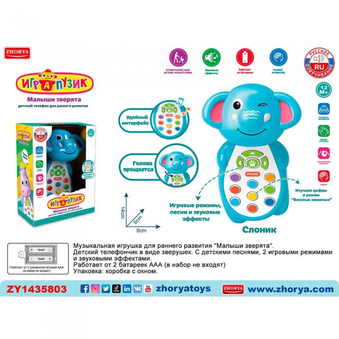 Телефон Играпузик Слоник на батарейках, русская озвучка, в коробке
