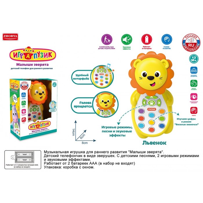 Телефон Играпузик Львенок на батарейках, русская озвучка, в коробке