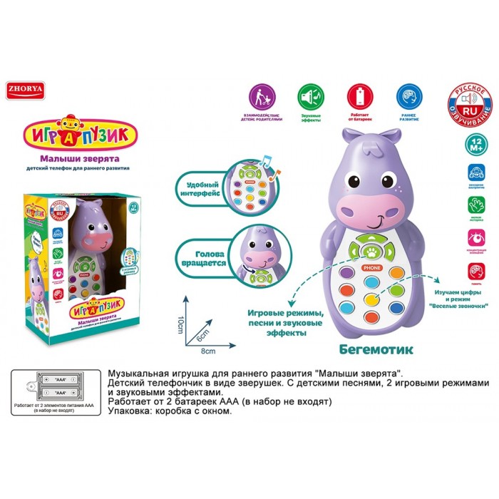 Телефон Играпузик Бегемотик на батарейках, русская озвучка, в коробке