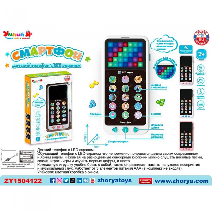 Размер упаковки: 13 х 4,5 х 21 см Размер изделия: 7 х 2,5 х 14,5 см Функционал: развивающая музыкальная игрушка Вид упаковки: картонная коробка Страна производитель: Китай Материал: пластик Комплектация: телефон - 1 шт Возраст ребенка: для детей от 3 лет Оригинальная яркая музыкальная игрушка с различными функциями - прекрасный подарок малышу. Особенности: - яркий дизайн - кнопки с картинками - световые эффекты - LED экран с сенсорными кнопками - песни, сказки, скороговорки - изучение цифр и цветов - игровой режим - работает от 3 батареек ААА (не в комплекте); - прочные безопасные материалы.