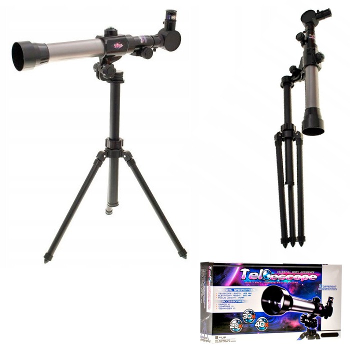 Размер упаковки: 43х8х22 см Упаковка: картонная коробка Состав: пластик, стекло Комплектность: Страна происхождения: Китай Начать изучение звездного неба и бескрайних просторов космоса поможет телескоп, с возможностью увеличения в 20, 30 и 40 раз. Этот телескоп станет отличным подарком для мальчиков и девочек, и они с удовольствием будут рассматривать луну, находить и узнавать созвездия, наблюдать за падающими звездами и просто созерцать загадочное мерцание в вышине. Характеристики телескопа: Длина телескопа: 405 мм Высота подъема: 250 мм Фокусное расстояние: 170 мм Увеличение 20х,30х,40х