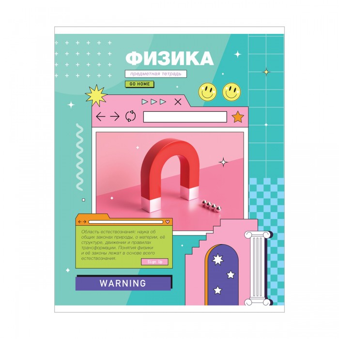 Тетрадь предметная «Физика» из серии "Пиксель" (в серии 12 предметов), со справочным материалом на обложке. Формат А5, размер – 165*205 мм. Вид крепления – скрепка. Внутренний блок состоит из 48 листов офсетной бумаги плотностью 60 г/м². Белизна 92%, линовка – клетка с полями. Обложка выполнена из мелованной бумаги с отделкой ВД-лаком. • Количество листов: 48; • Формат: А5; • Справочные материалы: на обложке; • Линовка: клетка.