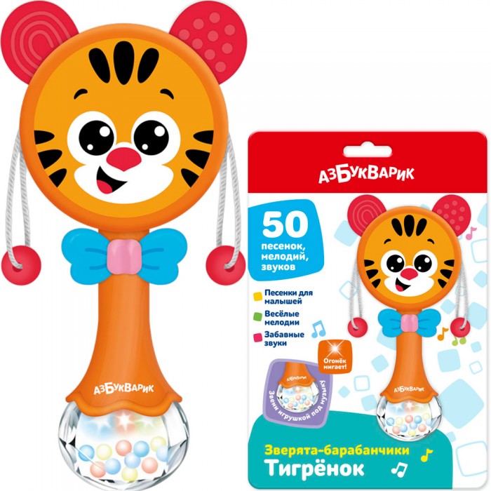 Размер упаковки: 16 х 4,5 х 24 см Размер изделия: 8 х 4 х 16 см Функционал: музыкальная развивающая игрушка Вид упаковки: блистер с картонной подложкой Страна производитель: КНР Материал: полимеры Комплектация: развивающая игрушка - 1 шт Возраст ребенка: для детей от 2 лет Традиционная игрушка для самых маленьких – теперь с музыкальной кнопочкой! Милый тигренок из серии «Зверята-барабанчики» подарит ребенку отличное настроение! Характеристики: - 50 песенок, мелодий, звуков - нажимая на кнопочки - воспроизводятся веселые песенки и мелодии - мигающий огонек - внутри игрушки шарики, которые создают звук погремушки - рельефные силиконовые ушки - для работы необходимы 2 батареи ААА 1.5 V (в комплекте демонстрационные)