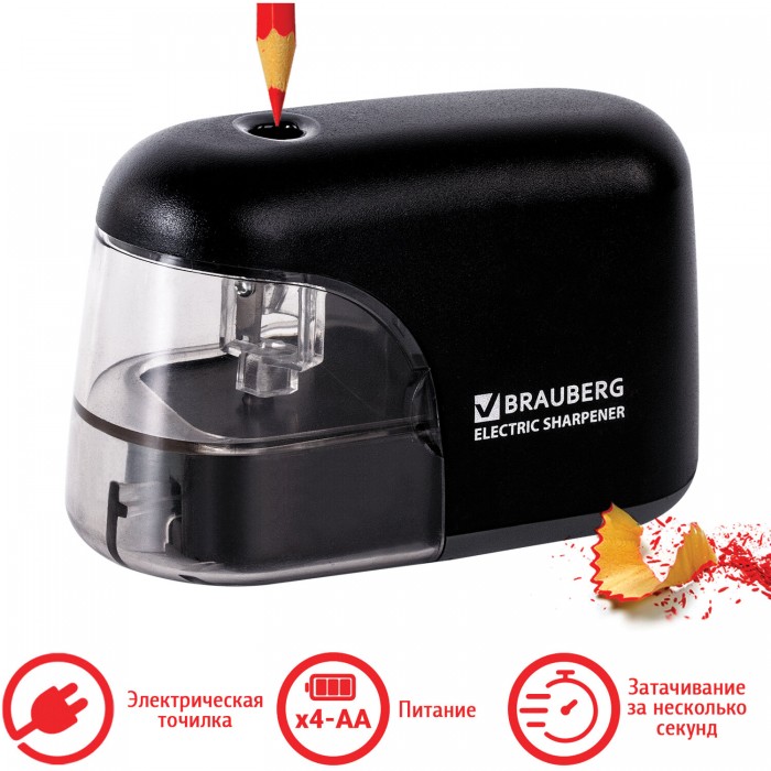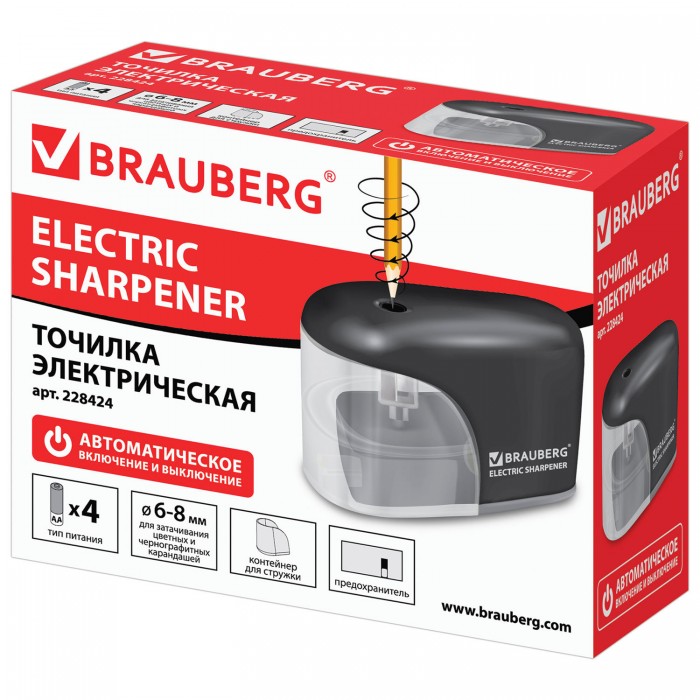 Электрическая точилка со съемным контейнером для сбора мусора и прямым лезвием, работает от 4 батареек АА (в комплект не входят). Предназначена для затачивания деревянных и пластиковых карандашей диаметром 6-8 мм.