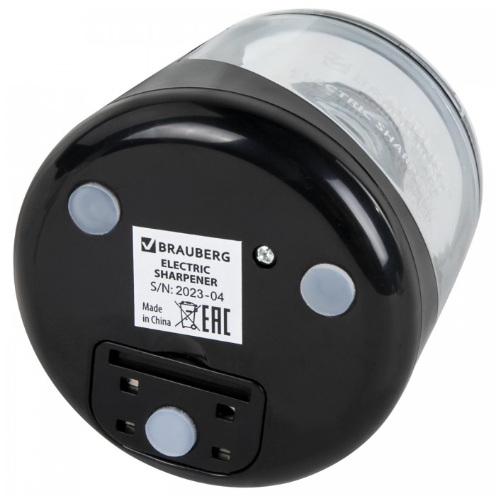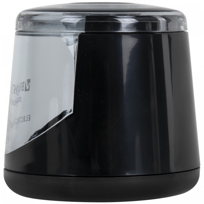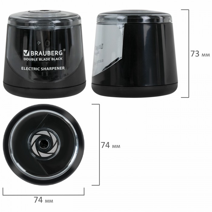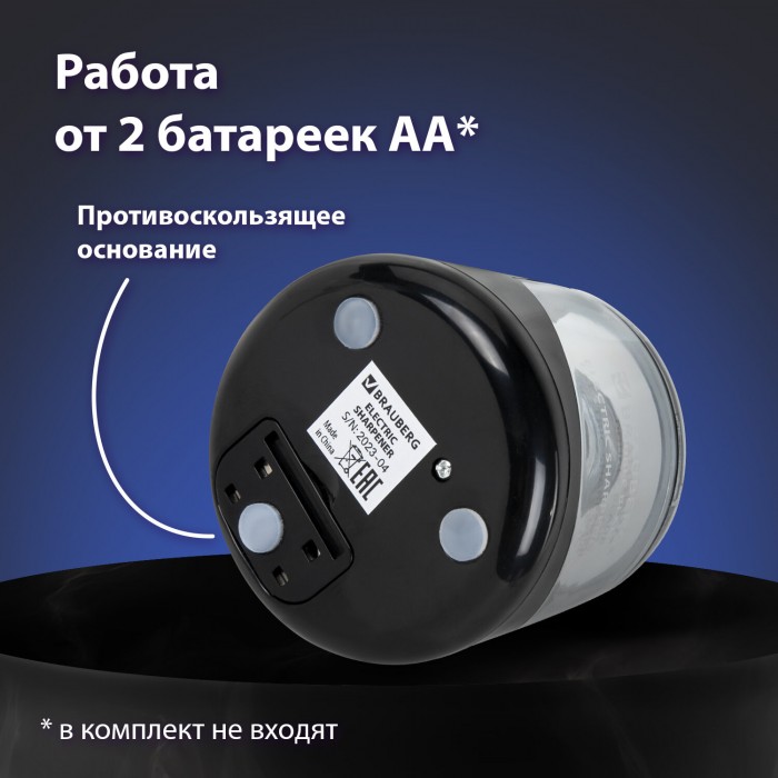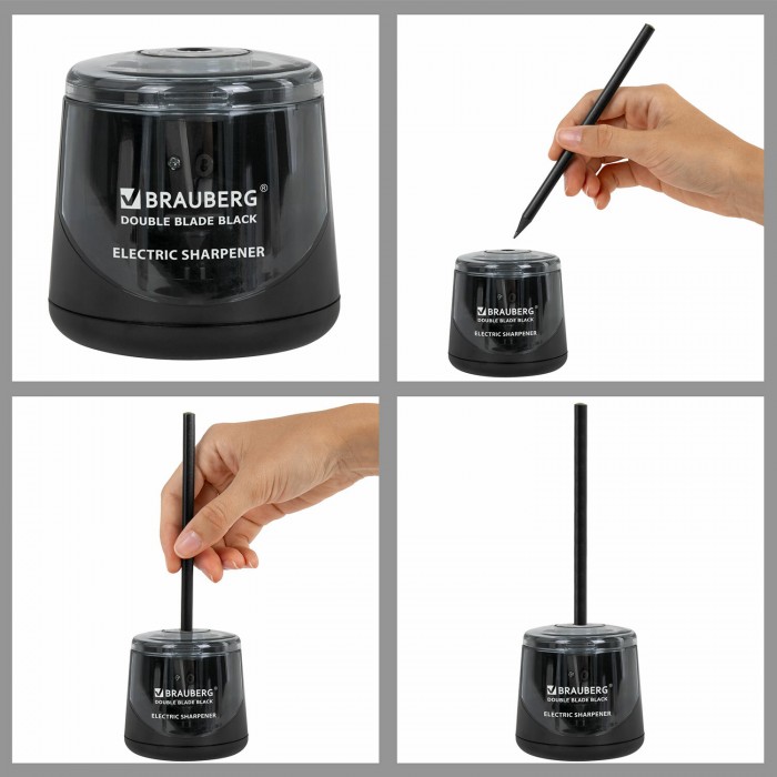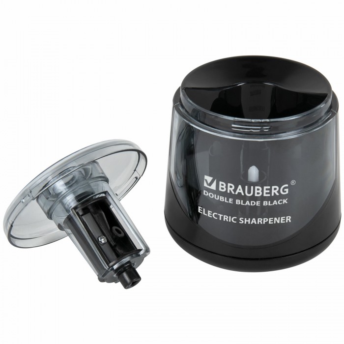 Электрическая точилка BRAUBERG DOUBLE BLADE BLACK с контейнером для сбора стружки и прямым двойным лезвием, работает от 2 батареек АА (в комплект не входят). Предназначена для затачивания деревянных и пластиковых карандашей диаметром 6-8 мм.
